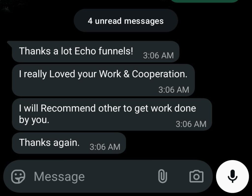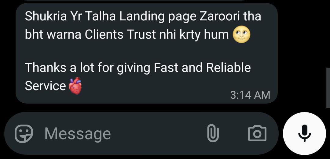 Working with Echo Funnels was one of the best decisions I made for my business this year. I used to rely only on WhatsApp and Facebook posts, and honestly, I never realized how many clients I was losing just because I didn’t have a proper website. Talha not only designed a clean, modern, and fast-loading website for my service business, but also helped me understand how to present my services in a more professional way.